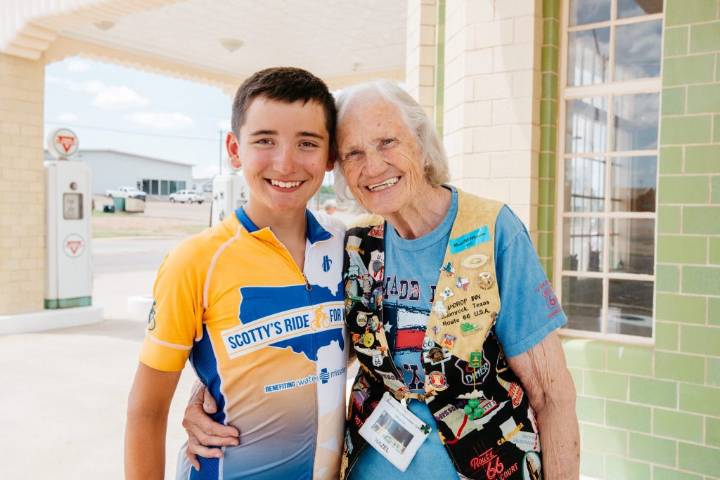 One of the best parts about the ride for water was the people we met. You know every day you hear something negative. People always talk about all the bad stuff in the world. This ride showed there is so much more good. Every day of this ride we met someone who was making a difference in their own way or supported the ride and wanted to help others. The second day of the ride we met a man in late 80’s that was in the military his whole life. He fought for our freedom. He came out and talked to us and shared his story. He took our picture and when we got home had mailed copies of the pictures he took. One lady that really hurt my heart came up to us at a gas station. She was trying to get home from her nieces wedding and only had $5 to get home on but she insisted I take it to help get people clean water. I tried hard to get her to take it back because she needed it but she was insistent she wanted to be a part of helping people. It wasn’t about the amount it showed the big heart she had. Another lady had heard about the ride on facebook and found us and had handmade a blue rose to signify water and gave it to me. She told us about the conditions she lived in growing up and how clean water meant so much to her. She worried about getting sick and her family members dying from diseases caused by dirty water. Now she doesn’t have to worry about that here but she was in tears because she was thankful we were trying to help people like her. There was this other lady her son joined us for half the day one day. She was a hair dresser and she volunteered to cut the whole teams hair. She gave 8 haircuts that day for free. She used her talents to help others. So cool. The lady in this picture is Hazel. She volunteers 3 days a week at Conoco on Historic Route 66. She moved there after her husband died and she just spreads joy to everyone she meets. She hugged us all was so nice and happy.